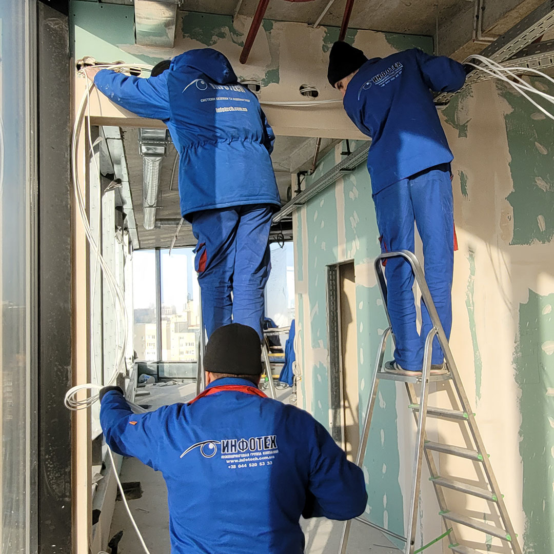 Для забезпечення надійності та безперебійного функціонування усіх систем безпеки, фахівці Інфотех почали роботи з прокладання СКМ (структурованих кабельних мереж), що мають 25-річну гарантію від виробника.